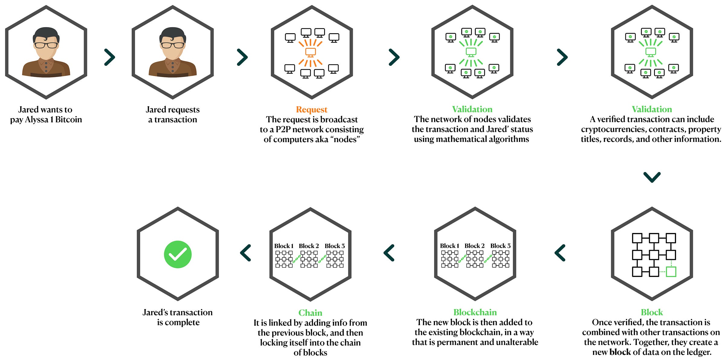 The network of nodes checks the transaction’s veracity and confirms it (consensus is reached).